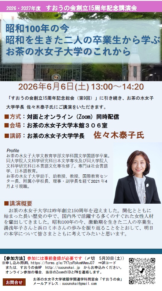 すおうの会では、創立15周年記念講演会ということで、お茶の水女子大学学長 佐々木泰子先生にご講演いただきます。 大学の創立からの歴史を踏まえて、これからに向けての示唆の多いご講演がうかがえることと楽しみにしております。多くの方のご参加をお待ちしたいと思います。